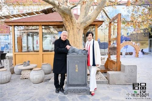 马未都(左)、吴小莉(右)与花肥肥铜雕像合影