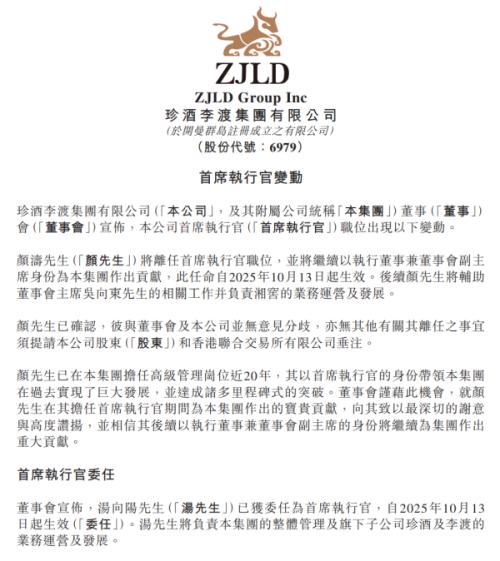 10月13日,珍酒李渡集团发布了一项引发行业关注的高管任命公告:任命汤向阳为集团首席执行官,颜涛则转任集团执行董事兼董事会副主席,两项任命即日生效。