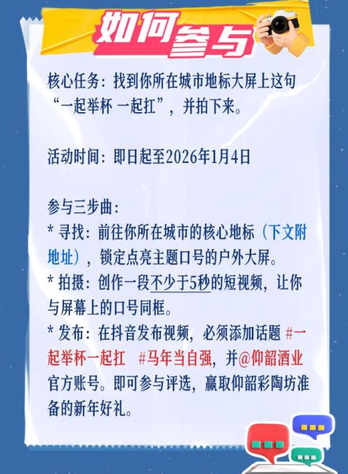 12月26日,仰韶酒业发起的#一起举杯一起扛 抖音短视频大赛正式上线。活动凭借鲜明的情感主张与诚意满满的奖励机制,迅速吸引众多网友关注!本次活动将持续至2026年1月4日24时,为期10天的创作窗口...