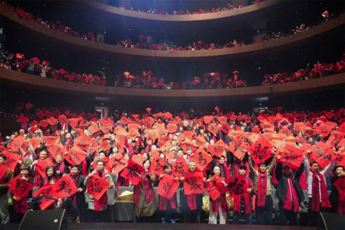 这份对守护精神的礼赞,在充满年味与温情的“送福”环节中得到延续与升华。由八位陶瓷艺术家联袂创作的《一马当先》瓷板画,以骏马奔腾、山河巍峨之象,寄寓了龙马精神的新年期盼。随后,在主持人杨澜的带领下,全场千余位嘉宾观众共同举起融汇各色书风的“福”字与“马”字,顷刻间汇成一片跃动的红色海洋。伴随着“马上有福”的齐声祝愿响彻大厅,这份源自瓷都的新春暖意与文化情感,伴随着后续的惊喜抽奖环节,化作可触摸、可珍藏的祝福,让守护与传承的美好寓意得以延续,深入人心。