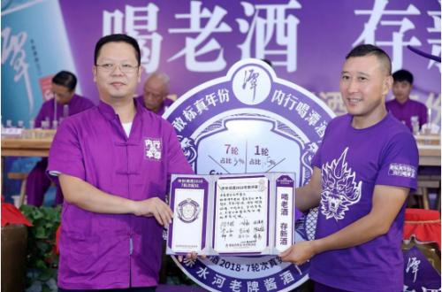 △中国酒业协会副秘书长甘权(左)向仙潭酒业集团董事长方久伦(右)颁授年份潭酒2018的配方比例及专家评语。