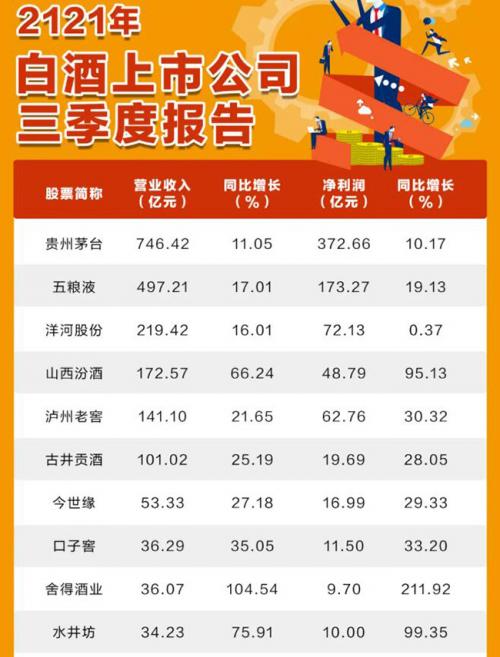 舍得酒业实现营业收入36.07亿元,同比增长104.54%,归属于上市公司股东的净利润9.7亿元,同比增长211.92%。酒鬼酒前三季度实现营业收入26.4亿元,同比增长134.2%,净利润7.2亿元,同比增长117.7%,单季度收入9.3亿元和净利润2.1亿元,同比增幅分别为128.7%和43.3%。