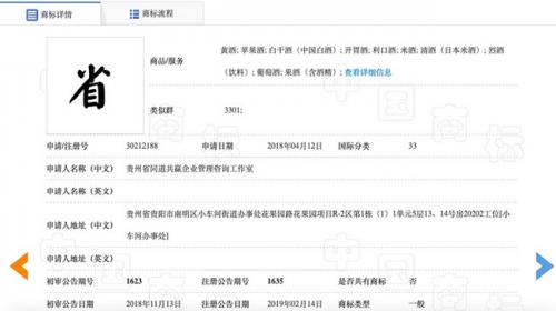 日前,酒业家从贵州多家企业获悉,贵州省同道共赢企业管理咨询工作室(以下简称同道共赢工作室)于今年注册多个带有“省”字样的第33类商标,包括省茅、省君品、省窖藏、省怀、省安、省民族、省镇等,涉嫌“碰瓷”贵州酱酒产业的多个知名品牌,并引起贵州多家酒企的关注。