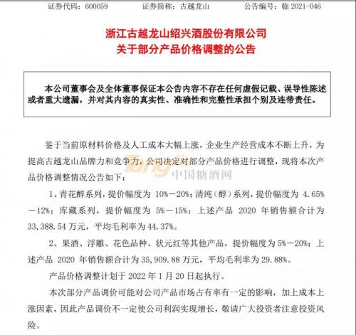 根据古越龙山的公告,本次产品价格调整情况为:青花醉系列,提价幅度为10%-20%;清纯(醇)系列,提价幅度为4.65%-12%;库藏系列,提价幅度为5%-15%;上述产品2020年销售额合计为33388.54万元,平均毛利率为44.37%。果酒、浮雕、花色品种、状元红等其他产品,提价幅度为5%-20%;上述产品2020年销售额合计为35909.88万元,平均毛利率为29.88%。产品价格调整计划于2022年1月20日起执行。