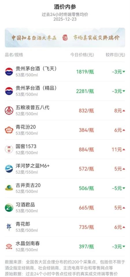 价格端的表现进一步印证了这一变化。据新浪财经“酒价内参”对约200个采集点的实时监测数据显示,12月23日,53度500ml飞天茅台终端零售价约为1819元/瓶。各省份的行情数据也能印证这一点。据“广西酒类行业协会”“浙酒快讯”“速达酒价”等平台监测最新一期数据,飞天茅台区域价格大体保持在1700元之上。其中,广西报1745元/瓶,浙江报1700元/瓶,河北为1730元/瓶。业内人士认为,多地价格区间收敛、波动有限,说明市场正在回归以真实需求为主导的理性运行轨道,也为后续动销的持续释放奠定了基础。
