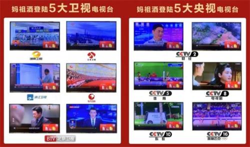 除此之外,妈祖酒还携手IPTV登录了央视2套、5套、8套、10套、16套五大央视频道,于奥运会期间强势出圈;并且相继亮相湖南、江苏、浙江、东方、北京五大顶流地方电视台,让全国更多观众熟知、青睐。