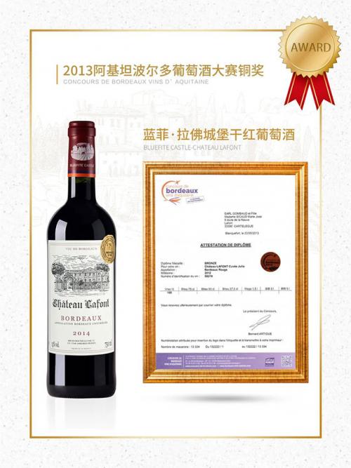 蓝菲国际酒庄的蓝菲系列红酒—拉佛城堡干红葡萄酒在大赛中斩获铜牌。