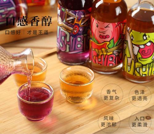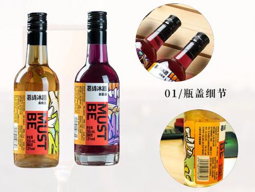 慕诗冰酒有三种口味,分别是:青梅、桑葚和果花。在产品包装上,采用夸张手绘风格,以黄、紫、红为主色调,色彩鲜明,吸引眼球,产品成列具有优势。