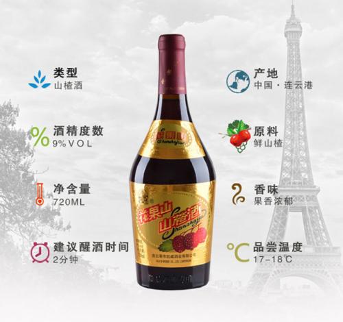 花果山牌山楂酒,产于江苏连云港花果山之麓。选用上等鲜山楂为原料,采用传统发酵工艺和技术,经名而精心酿制而成。有少量沉淀不影响饮用。