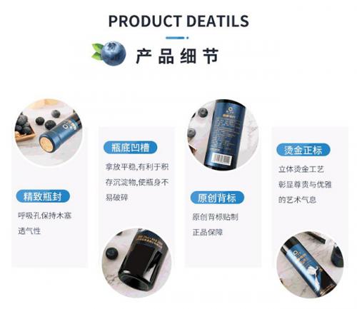 采用精选蓝莓、全果发酵,低温精酿、冷冻过滤、充氮罐装、21道工序,致力于用先进的技术、先进的设备、先进的管理,酿造出酒中新贵―晶华年代蓝莓酒