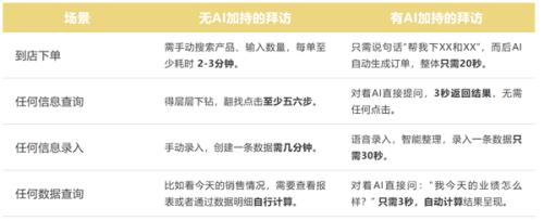 通过以上介绍,相信大家已经切身感受到了AI访销大脑给业代人员带来的改变,下面用一个表格重点呈现对比。