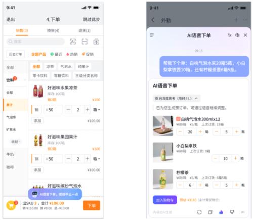 场景案例:小王在门店里忙碌着,他一边整理货架,一边与老板确认着订单。核对好要补的货和要上的新品后,他拿起手机,对“AI访销大脑”下达指令:“帮我下个单:白桃气泡水来20箱5瓶,小白梨拿铁要10箱,还有柠檬茶要6箱5瓶。”
