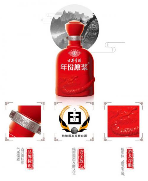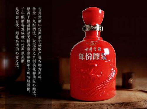 古井贡酒年份原浆(幸福版)外盒采用金卡材质,金与红的经典配色设计,包装喜庆大方,寓意幸福吉祥;瓶身采用玻璃喷涂工艺,健康环保,瓶型似盘龙玉玺,古朴稳重,寓意皇室贡品和权贵象征。