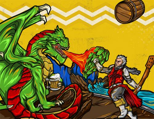 该酒标描绘了圣灰(ST-GERY)和一条凶猛龙之间的战斗。圣灰是一位中世纪的酿酒师,而一条恶龙正在守护着一杯古老配方的酵母。为了得到酵母,他用捣碎的麦芽的棍子与龙展开了斗争。这场战斗象征着酿酒师与啤酒原料的斗争,每一款美味的啤酒背后,都是一场酿酒师和啤酒原料的战斗。