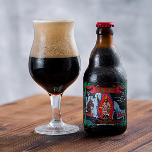 该酒标描绘了希腊神话中的地下黑帝斯,享受着只属于他的海底士的啤酒。他的渡船卡戎(CHARON)在带着新死者的灵魂穿过冥河同时也装载着他最爱的桶装啤酒。他巨大的三头监护犬塞伯鲁斯和黑帝斯共同组成了这幅场景。