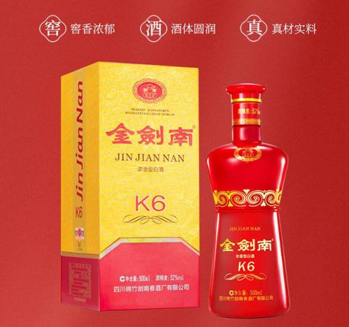 金剑南K6运用剑南春特的制酒工艺,采用低温入窖,传统黄泥老窖固态发酵,很好的增加了酒的香味;口感非常醇正,滴滴醇厚。它的瓶身选用玻璃的材质,质地细腻,很好的储存酒,还采用LOGO图案点缀,彰显品牌辨识度。