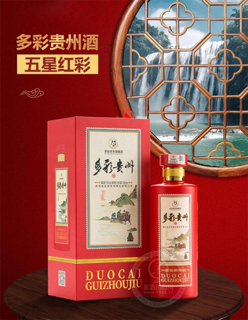 旗下的多彩贵州酒(五星红彩)作为一款婚宴必备酒水,包装上绘有茅台酱酒生产场景,时时刻刻向大家彰显其内在品质,并以邮票的设计理念,意为邮寄给世界的一瓶酱香好酒;红色的包装设计,寓意着红红火火,为每一场婚礼带来喜庆的氛围!