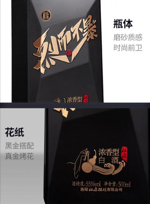 杜康烈而不暴,55度高度浓香酒。磨砂质感、时尚前卫光瓶酒,瓶身黑金搭配,真金烤花工艺,尽显高端品质。