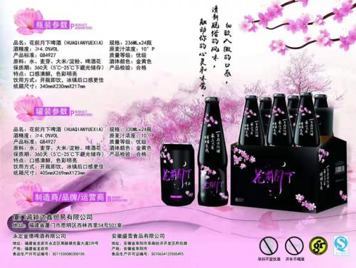 花前月下啤酒是一款特酿熟啤,选用优质小麦芽、啤酒花、鲜酵母、山泉水等为原料。采用传统酿造技术,因此该啤酒口味醇厚、甘爽。