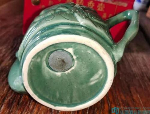 1月19日,《华夏酒报》记者在河南郏县城东南“中原第一红石古寨”——临沣寨“临沣寨酒器博物馆”见到了鸳鸯转香壶。据馆长李占显介绍,他收藏的鸳鸯转香壶是仿汉代鸳鸯转香壶,该收藏品为1980年代作品,属于纯手工制作,天青釉,壶高12cm,底部直径8cm,壶柄与壶嘴之间的最大直径为16cm。壶盖为圆塔造型,分三层,最顶层为塔尖,塔尖为圆球状,略有椭圆。壶身雕刻有腾龙凤舞的精美图案,雕刻细腻,色泽如初。