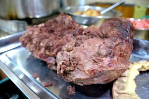 与此同时,卤锅揭开,软糯醇香的驴肉在陈年老汤中微微颤动。只听“刺啦”一声,热火烧被横刀片开,师傅麻利地塞进热腾腾的驴肉、焖子、板肠,再淋上一勺混着高汤的金黄驴油——那香气,足以唤醒整条街巷的睡梦中人。